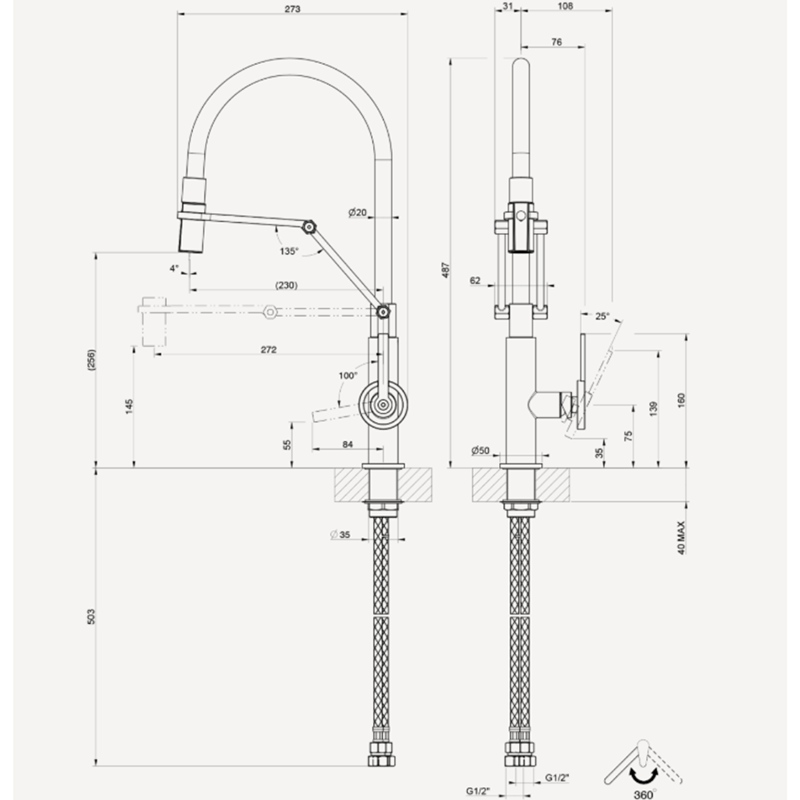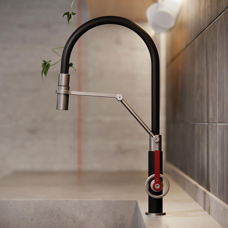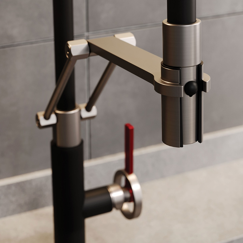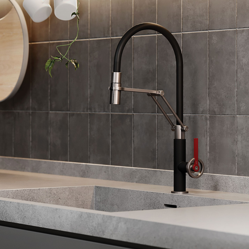 Colecția Officine V de la Gessi readuce într-o viziune contemporană estetica industrială emblematică a epocii. Disponibilă cu pipă pivotantă, duș extractabil sau furtun flexibil, gama Officine V se remarcă prin designul său industrial distinctiv și funcționalitatea avansată.